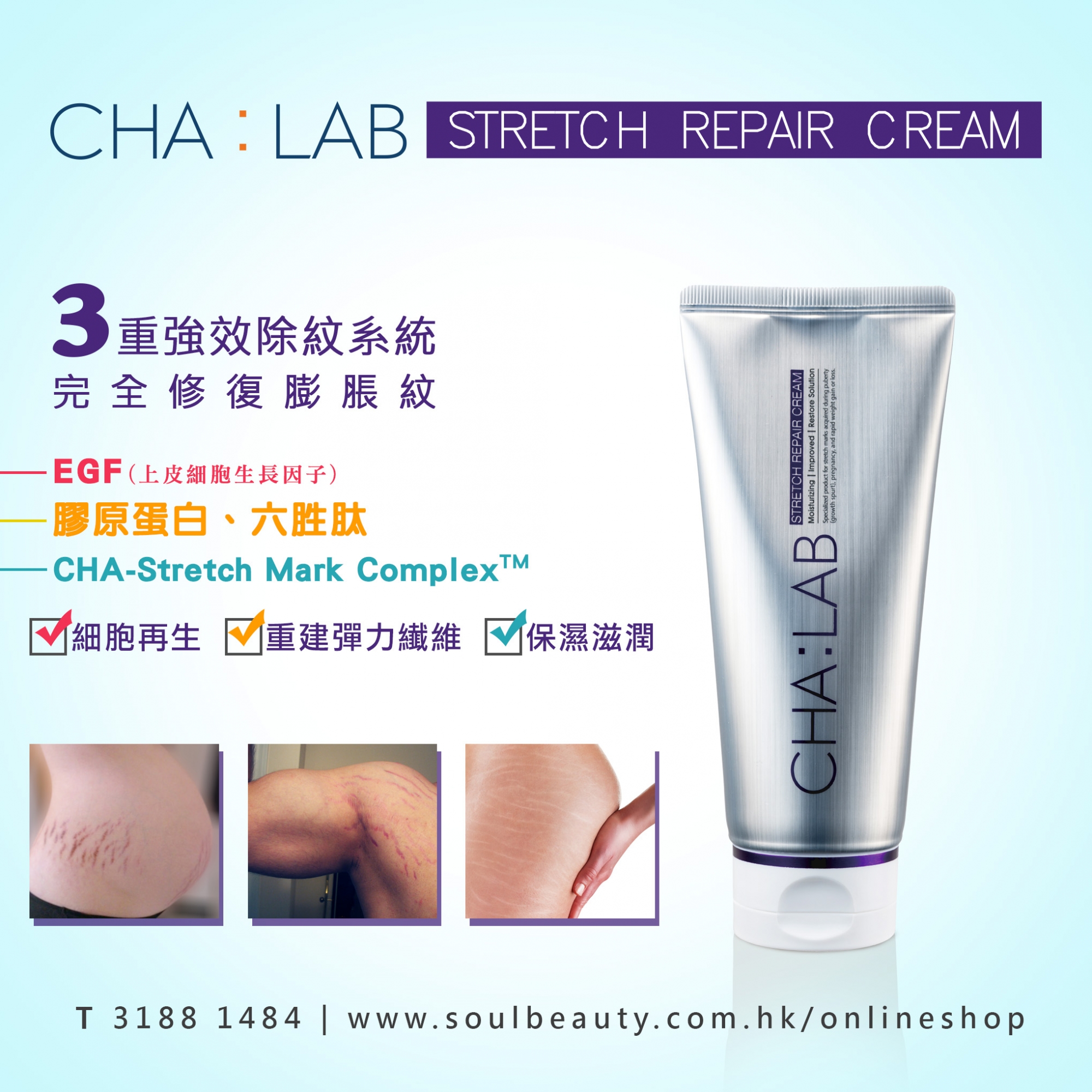 ● CHA-Stretch Mark ComplexTM 專利保濕配方,增進膠原蛋白和彈性纖維形成