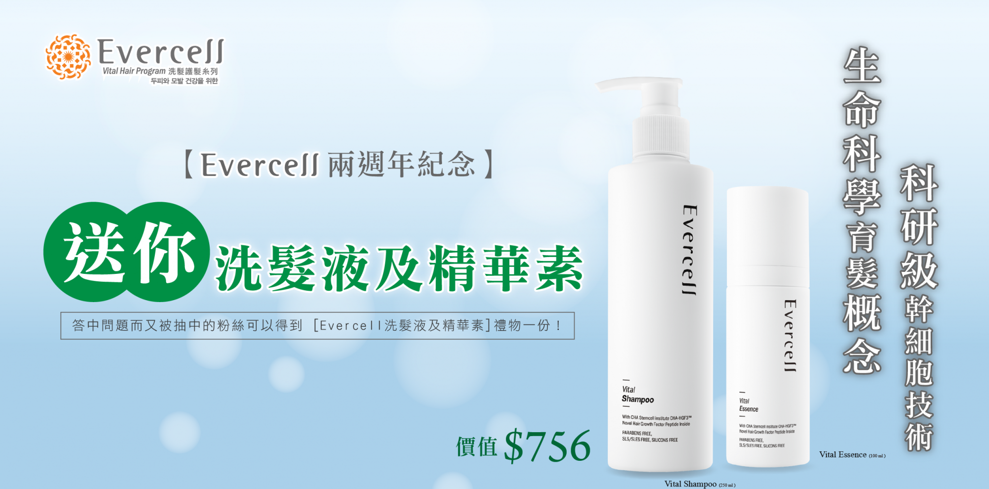 【兩週年紀念 –送你Evercell洗髮液及精華素共三份, 每份價值$756】